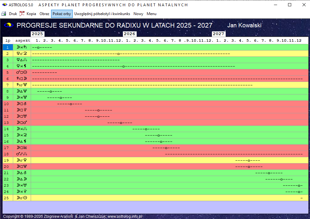 Poniżej, z lewej, przedstawiono tabelę rocznych aspektów planet progresywnych do planet radixowych. Pokazano orby aspektów, a dokładny aspekt wyróżniono ciemniejszą barwą. Liczbowe wartoci orbów można ukryć, jak pokazano obok na rysunku z prawej, który przedstawia trzyletnie aspekty progresywne do planet natalnych, z kolei z pominięciem półsekstylu i kwinkunksa.