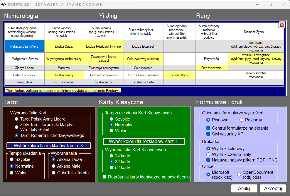 Ustawienia składają się z sześciu głównych opcji: ustawienia numerologiczne, Yi Jing, Run, Tarota, Kart Klasycznych oraz ustawień formularzy i druku.