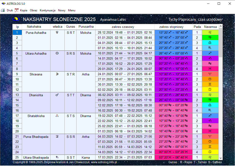 Nakshatry Słońca w okresie rocznych pokazano poniżej.