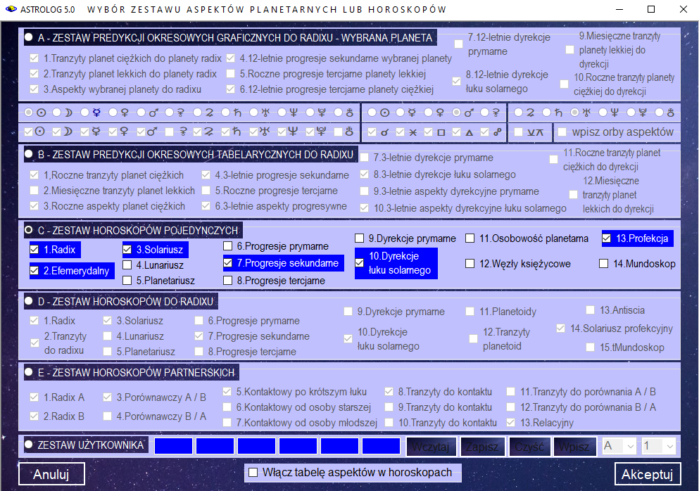 formularzu 6 wybranych tabel aspektów, wykresów graficznych lub horoskopów. Formularz zestawu podzielono na sześć części: