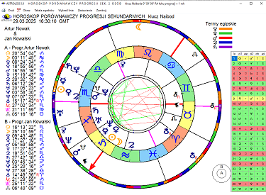 Horoskop porównawczy dwóch horoskopów progresji sekundarnych powiększony w lupce przedstawiono poniżej. Orby są zgodne z ustawieniami przyjętymi dla horoskopu porównawczego.