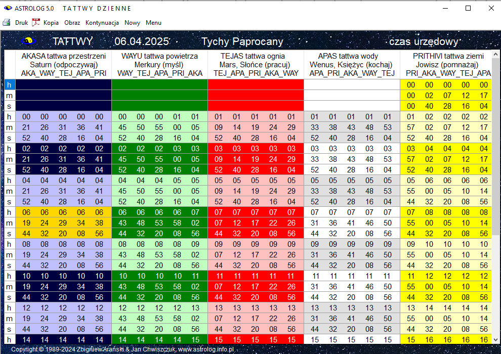 rozpoczynającą wraz ze wschodem słońca nowy cykl tattwiczny, zaznaczono
