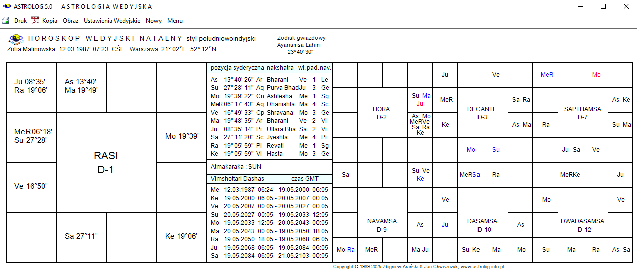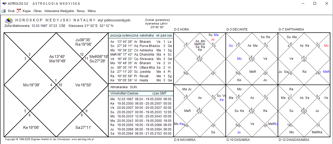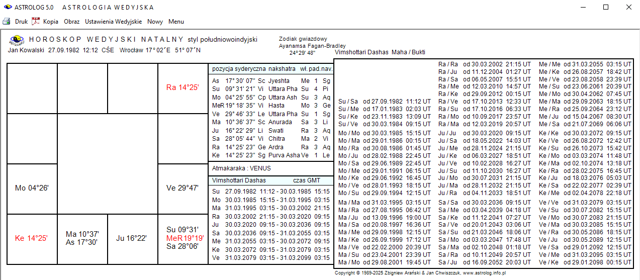 Można również wybrać obliczenie okresów Dashas Maha/Buktijak przedstawiono poniżej oraz Dashas PratyAntar dla wybranej planety.