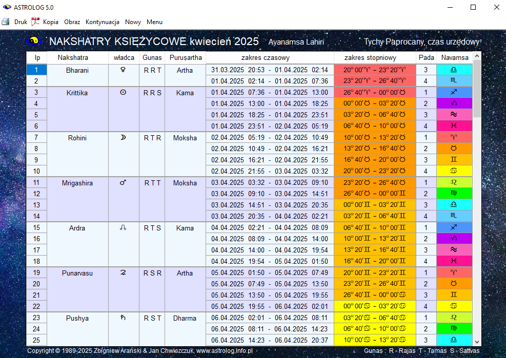 Nakshatry Słońca w okresie rocznych pokazano poniżej.